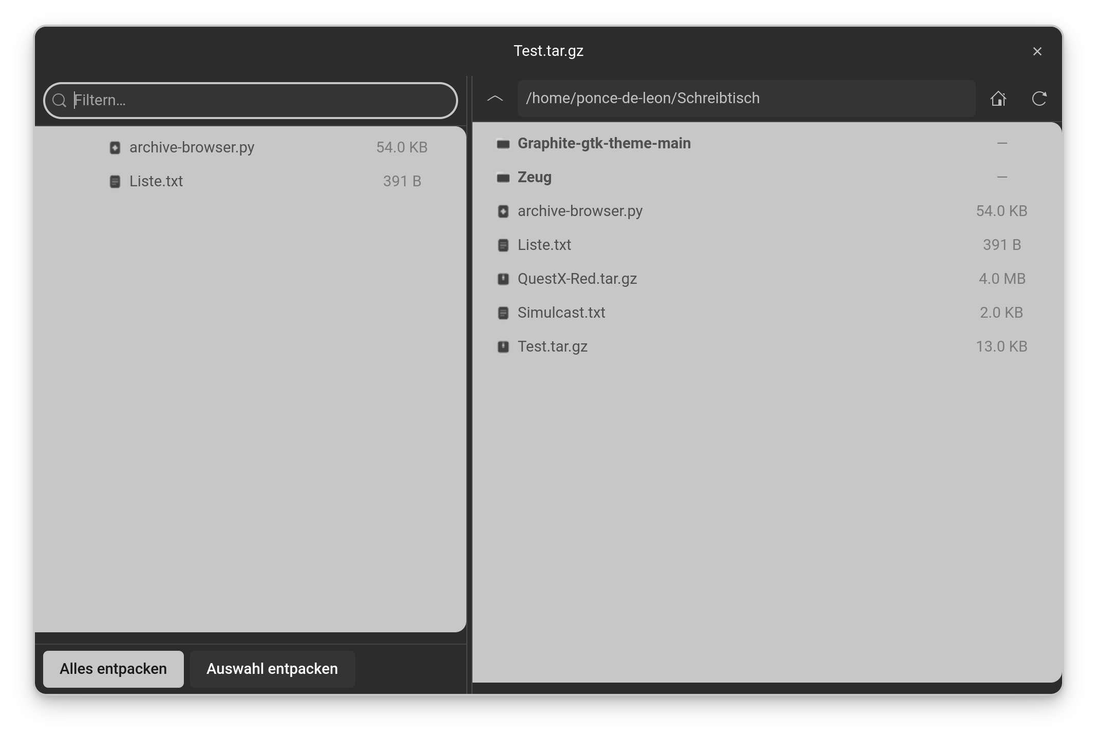 Drag & Drop β drag files from the archive directly into any folder in the right panel or in Nautilus