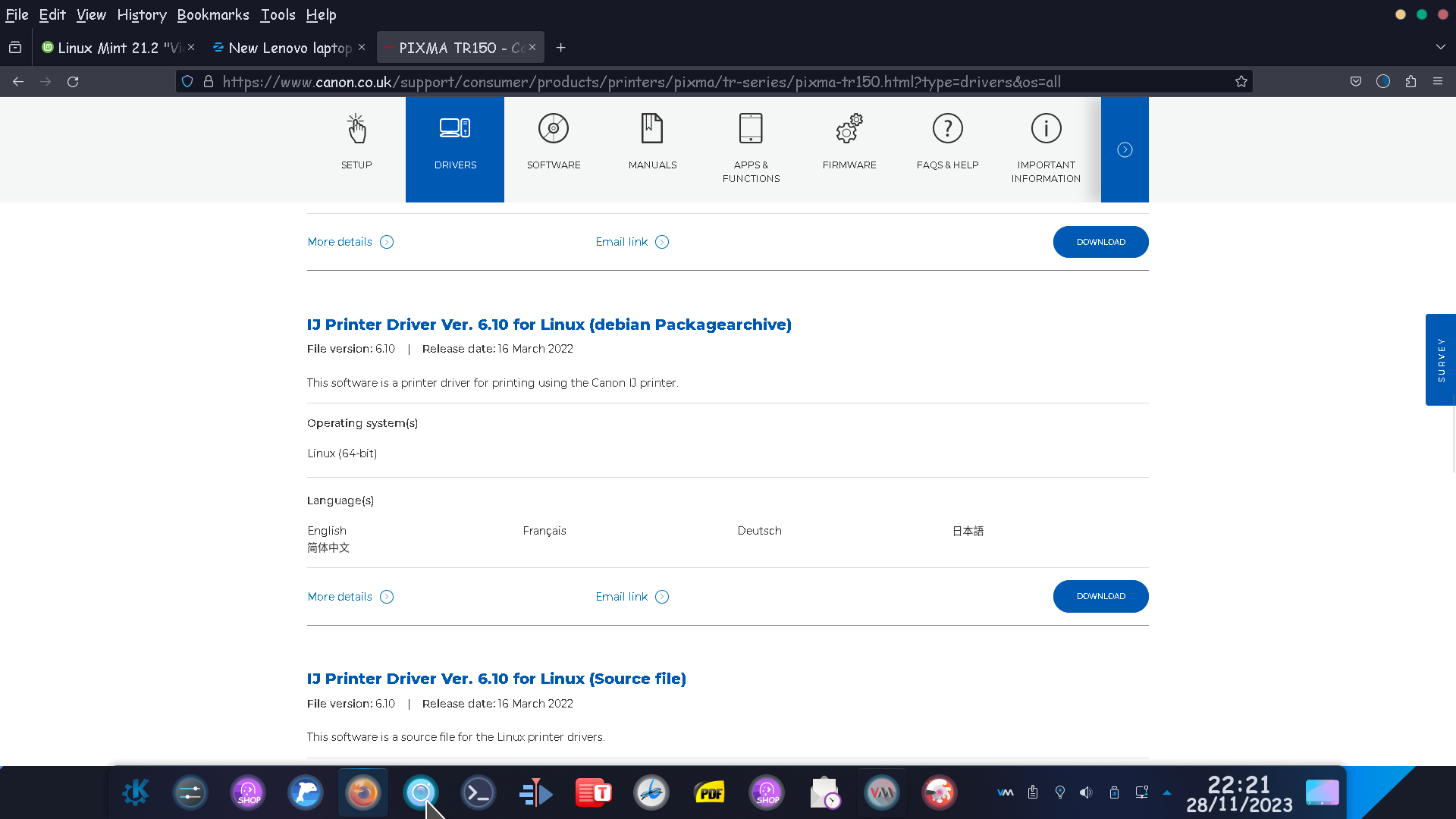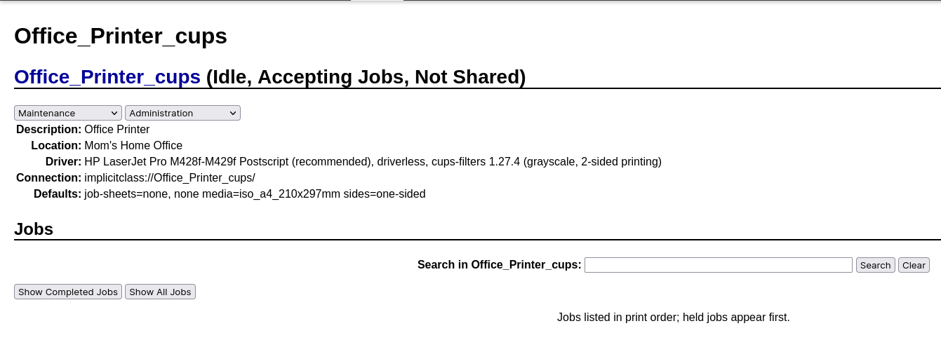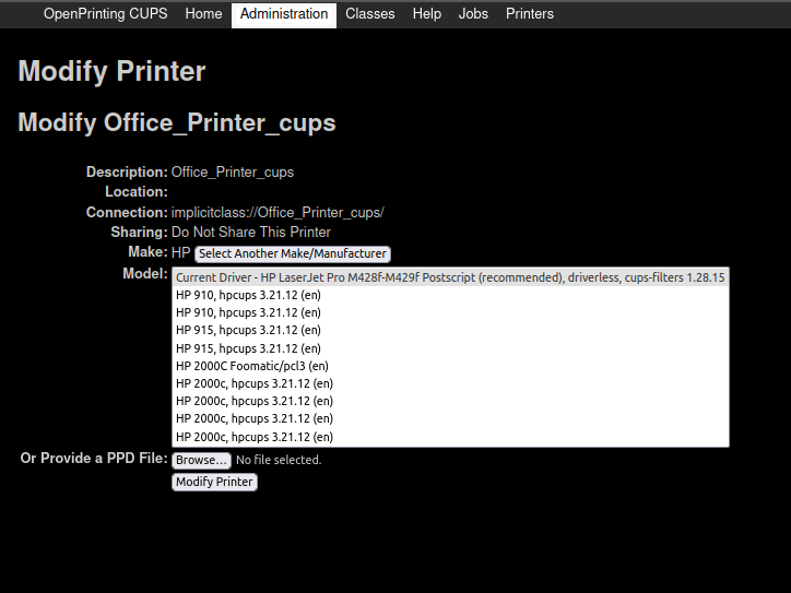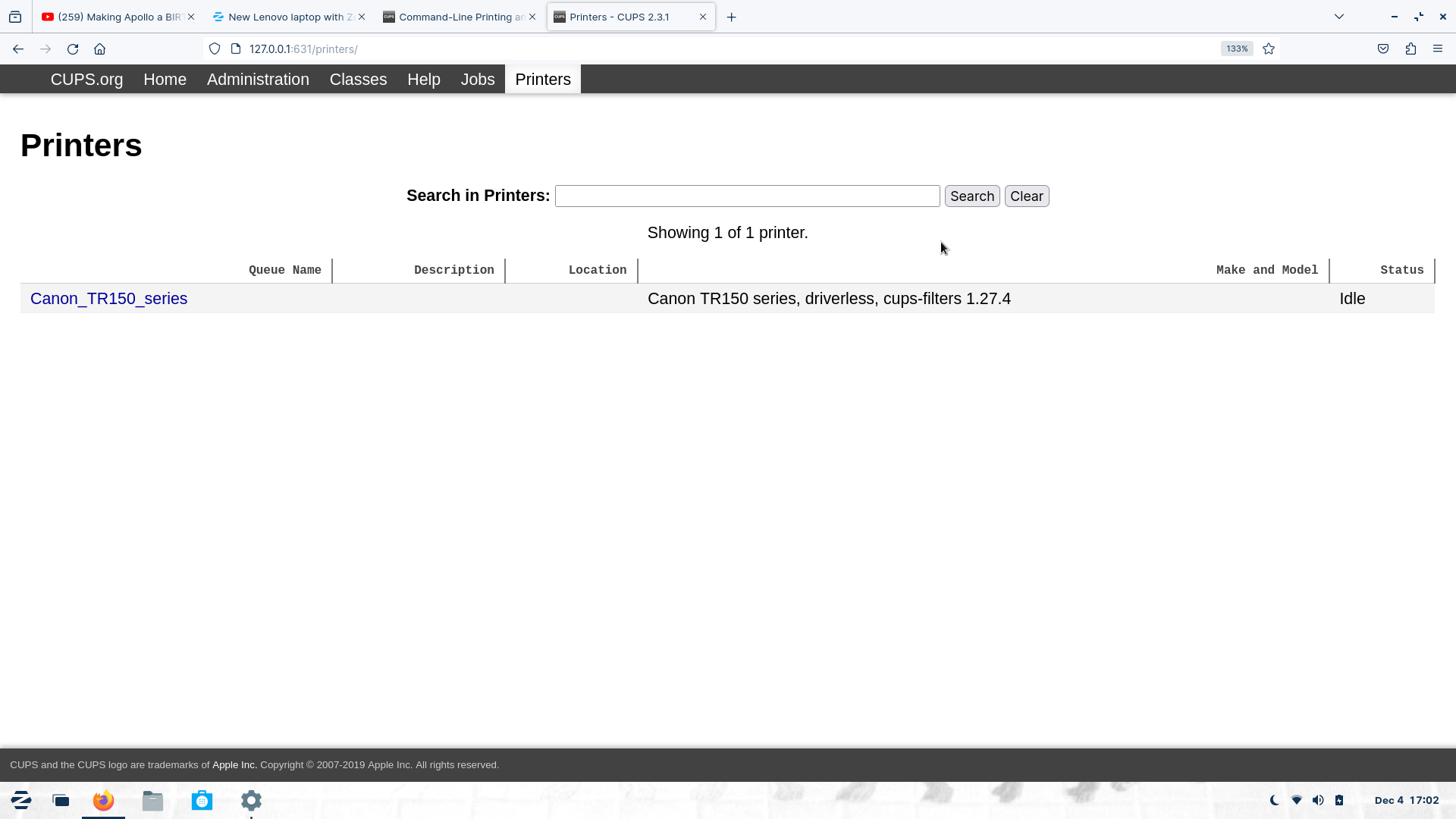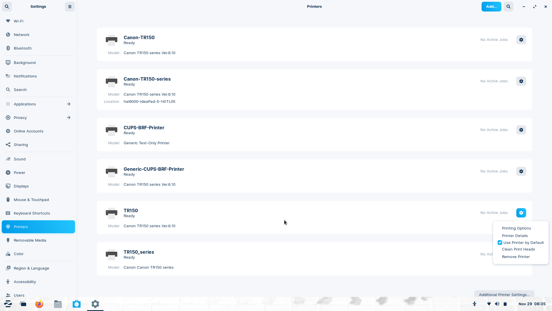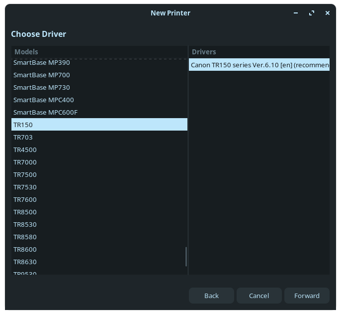 Even though it is a Pixma the newly installed driver comes at the bottom of the list - note it lists all the other TR Printers supported by the IJ Package - and why is it at the end and not under the Pixma Section? Remember, Canon does not work for Canonical, or GNU/Linux!