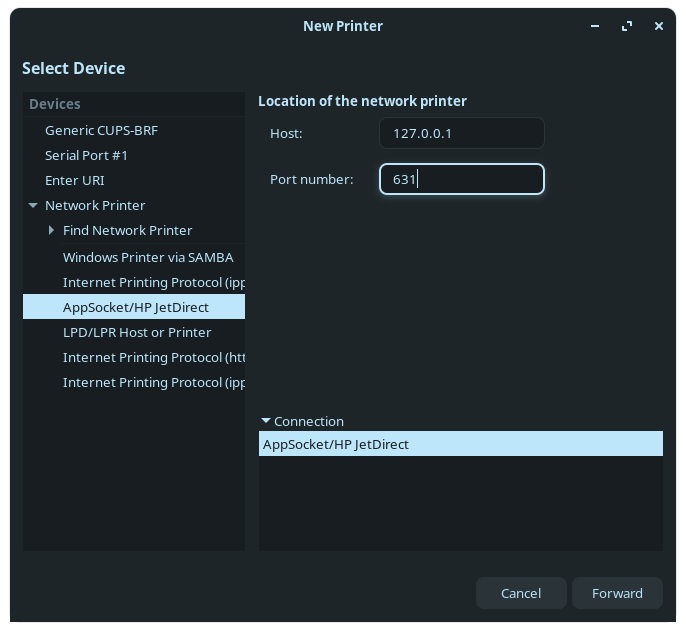 Choose 'AppSocket/HP JetDirect and enter the following information in the fields: