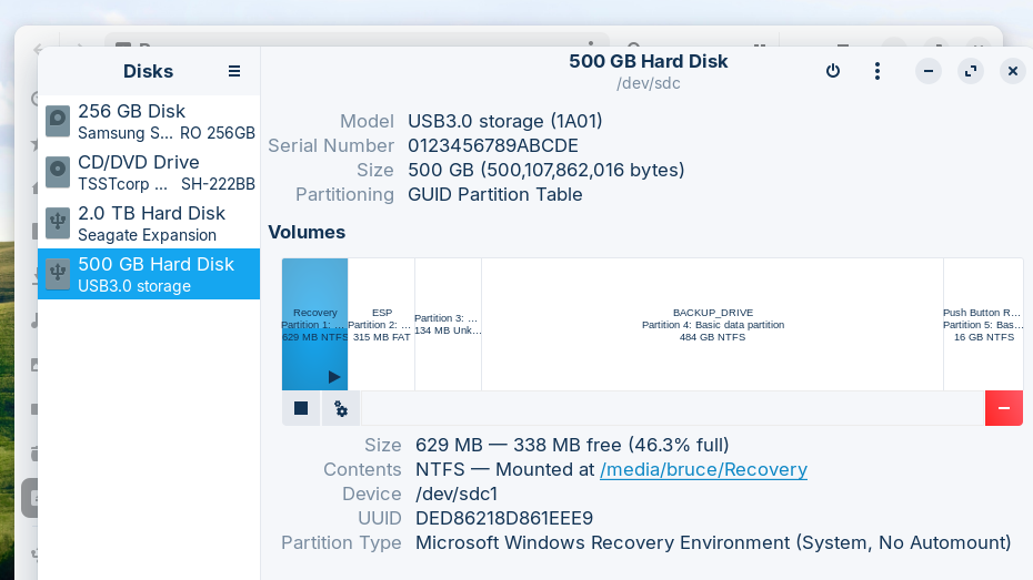 It mounted in /media/bruce/recovery ?