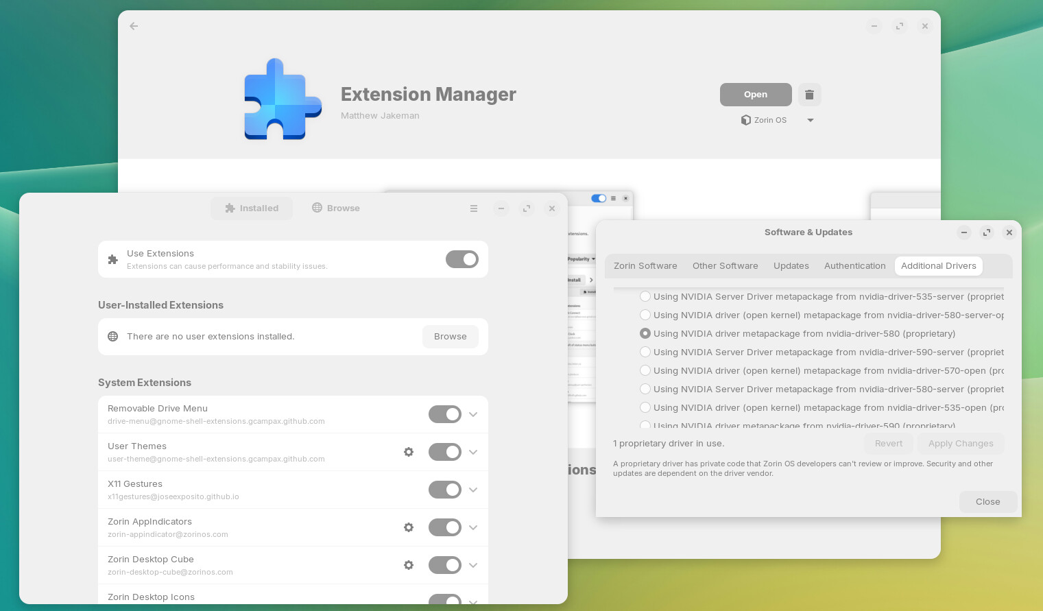 See the screenshot for the GPU driver that Zorin selected for my configuration, as well as all the various extensions that are used by the Gnome desktop.
