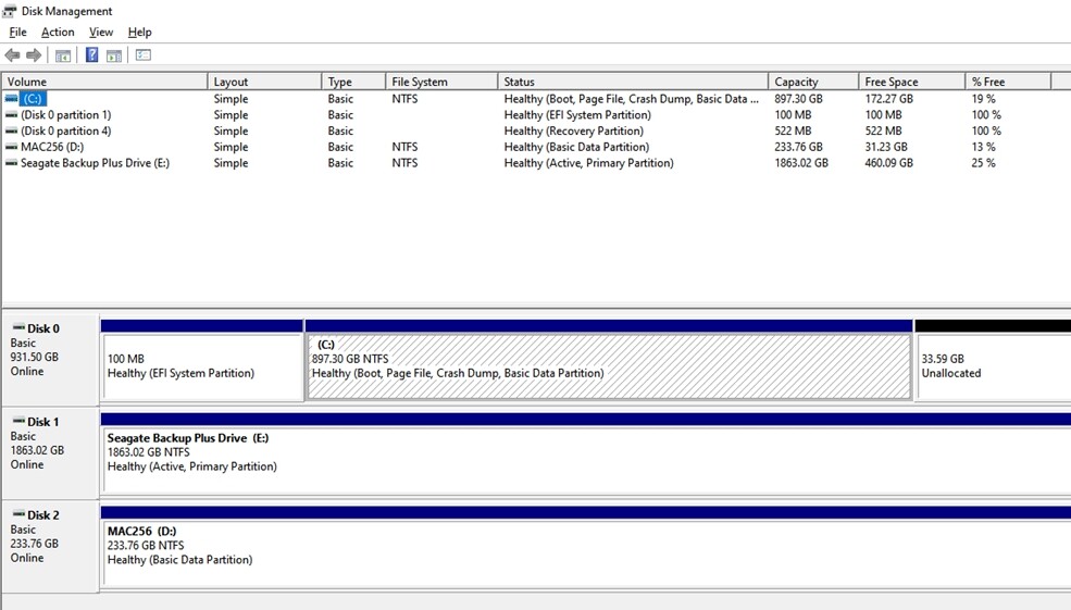 This is what my disk status looks like in Windows. I'm fairly sure the unallocated 33.59 GB represents my attempted (successful?) partition during my failed installs, but I don't understand why it doesn't show up in the volume listing.