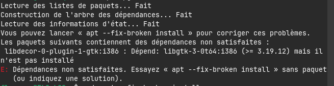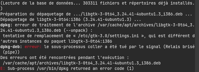 hello, I am new to Linux and I am encountering an issue with the update of my packages. While doing the sudo apt upgrade command, I was told "The following packages contain unmet dependencies: libdecor-0-plugin-1-gtk:i386: Depends: libgtk-3-0t64:i386 (>= 3.19.12) but it is not installed". He suggests that I use the sudo apt --fix-broken install command, but when I do it it still doesn’t work and he shows me the following errors: "/var/cache/apt/archives/libgtk-3-0t64_3.24.41-4ubuntu1.3_i386.deb" "E: Sub-process /usr/bin/dpkg returned an error code (1)".