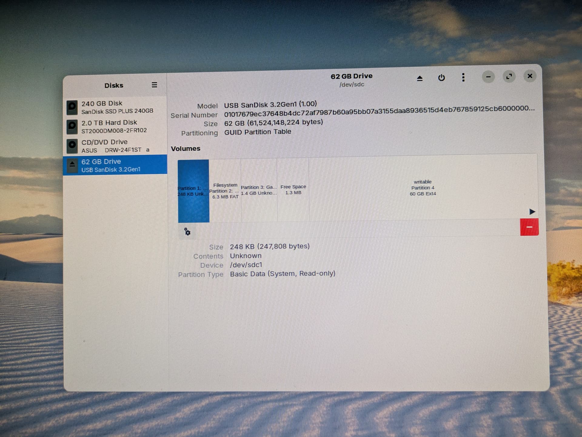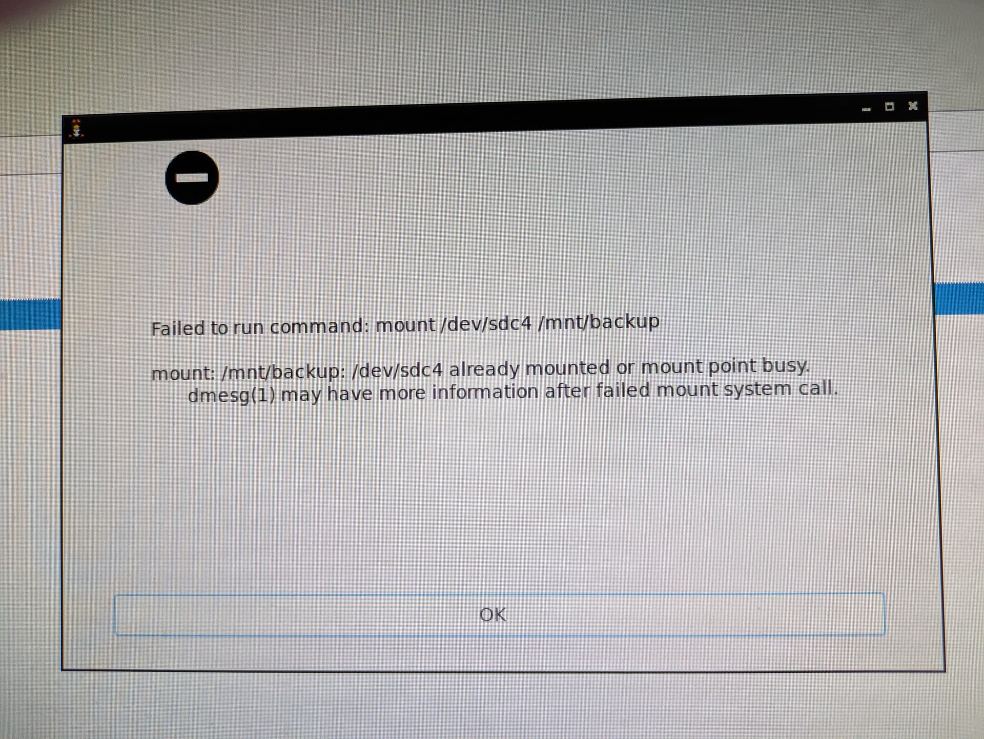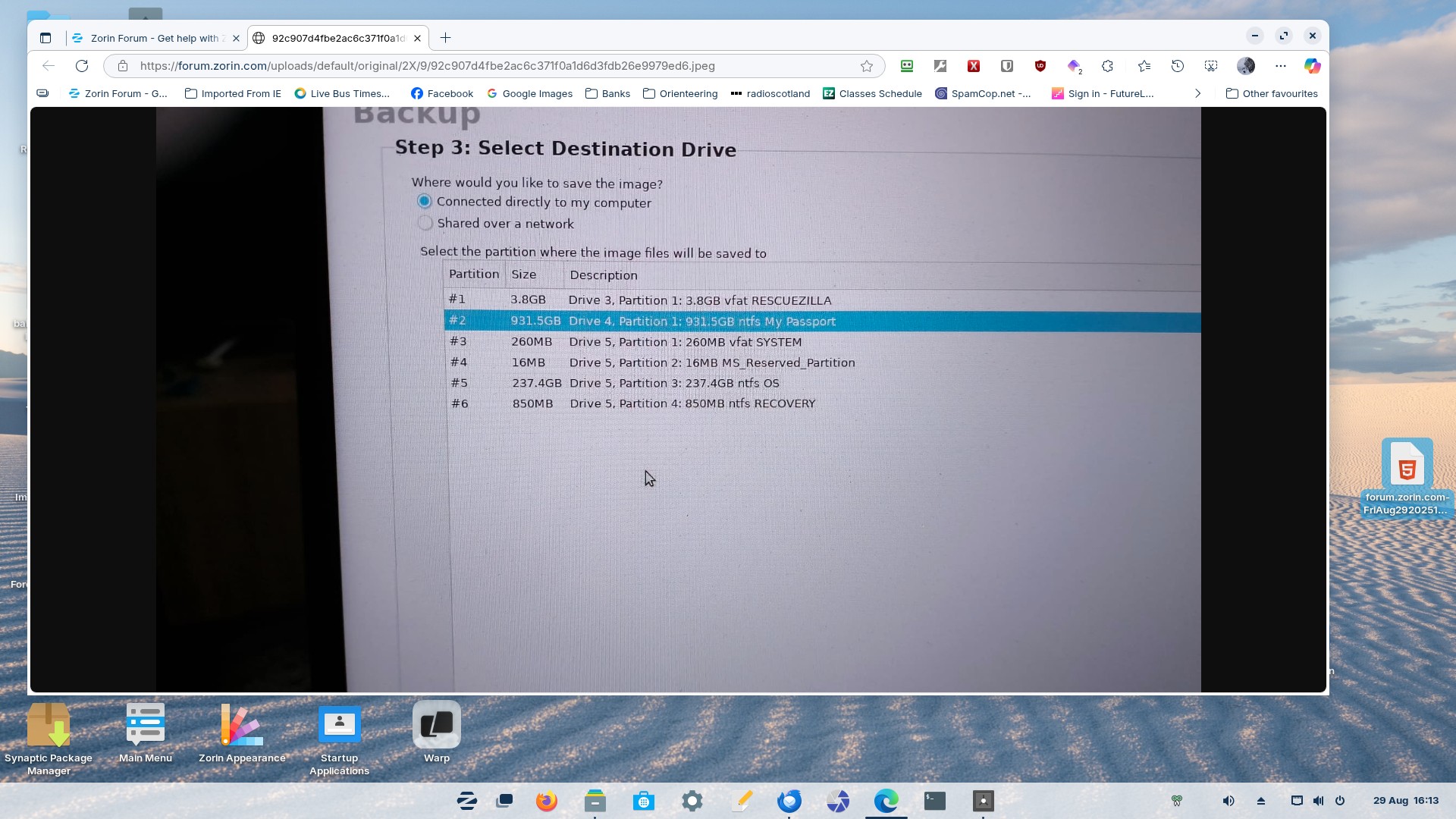 The first photo should show where I'm trying to back up to on the USB drive, the second should be the message, the third should be what my USB drive looks like in Disks and the fourth shows the corresponding photo in the Zorin tutorial on this - only one partition showing, whereas mine has several - is this relevant?
