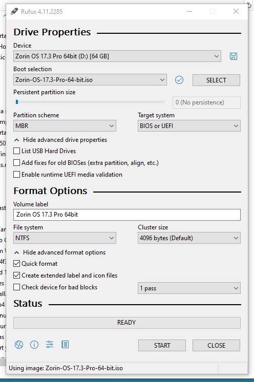 This is the Rufus screen I get. I only have NTFS as an option for the file system. When I start it, it gives that warning, but seems to make the image. But the computer I am trying to set up with linux doesn't see it as a boot drive, it just goes to the HD that has windows on it. I checked the BIOS, and it is supposed to check remo0vable device as the first boot source.