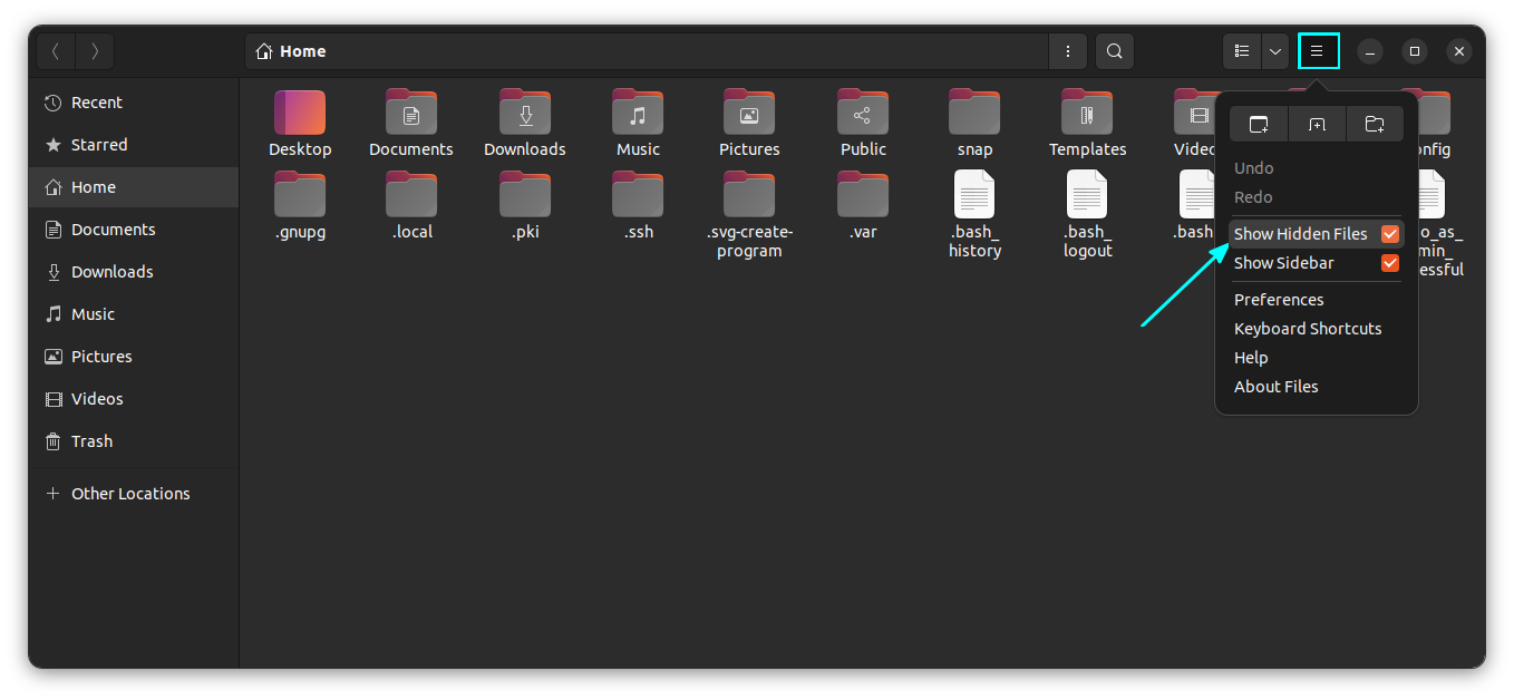 (Press ctrl+h to show hidden files in file manager or enable "show hidden files" in Hamburger menu)