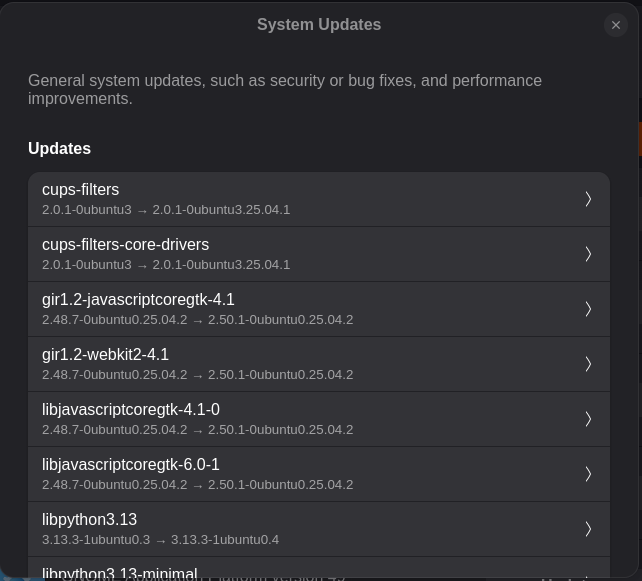 Here's some further evidence of differences. Went back into Ubuntu, this time 25.04, and a "System Updates" pane shown in earlier post is showing today: