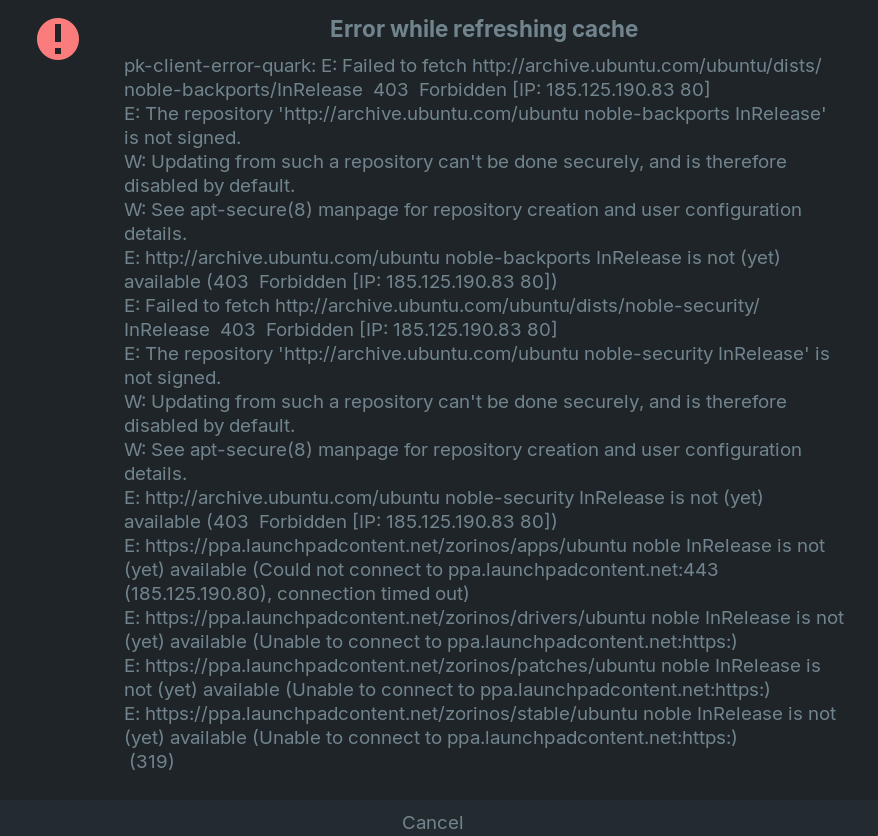 Hello - I have Zorin 18 Core installed, and was going to upgrade to pro today, when I also realized that I wasn't geting any alerts about updates. As part of the upgrade process, the first step is to run the software updater. Upon doing so, I also received the same errors mentioned at the start of this article.