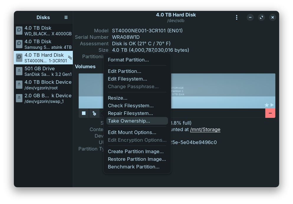 The reason I wanted to dig further into this was because I though this was an external drive. Whether a drive is internal or external makes no difference whatsoever — a drive is just a drive — but it does change how the system handles it. When an external drive is plugged in, the system understands that whoever is currently logged in will be using it, and as such the ownership of that location is assigned automatically to that user.