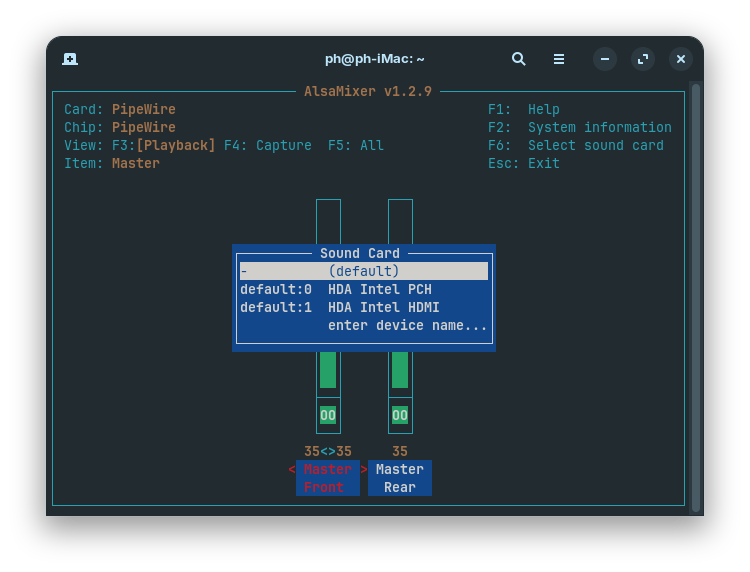 I am puzzled why alsamixer is showing "PipeWire" for both sound "Card" and "Chip", instead of the actual hardware from your first screenshot.