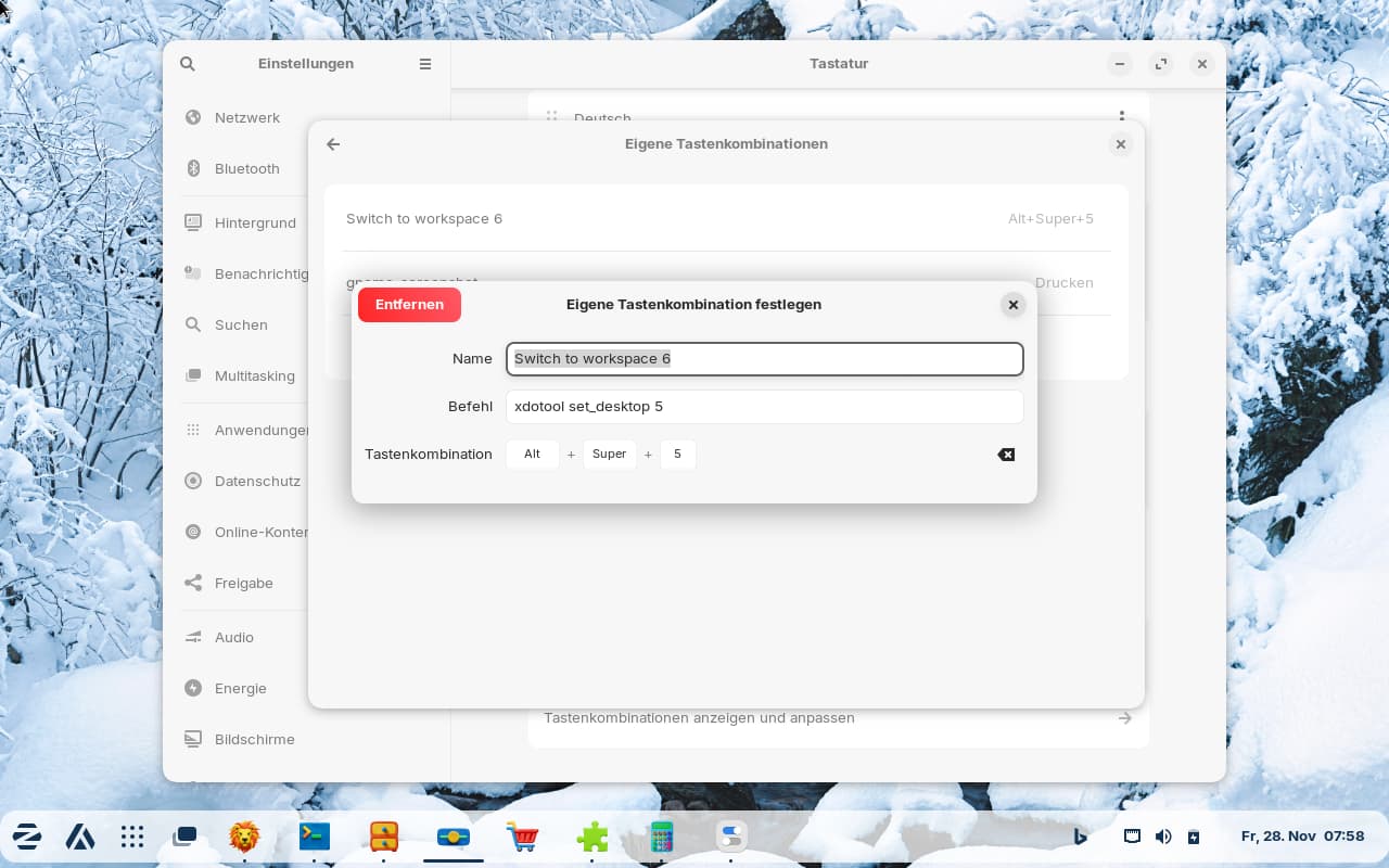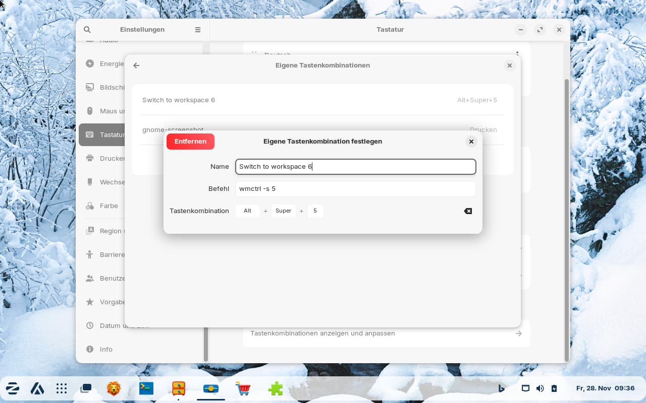 Does anyone know what command to enter if you want to create a custom keyboard shortcut for switching to workspace 6, for example, in the normal keyboard settings? I haven't yet figured out how to modify the gsettings command to enter the key sequence using the keys on the keyboard. That would be much easier than figuring out the command sequence for the bracket.