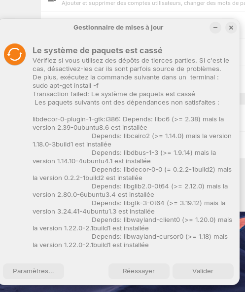 Comme le montre la copie d'écran ci-jointe, l'outil de mise à jour logiciels répète depuis plusieurs jours le même blocage, "système de paquets cassé", avec une liste.