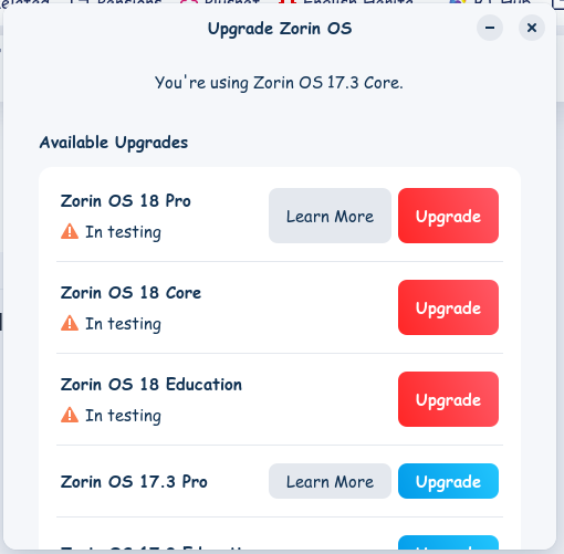 New Linux user here, investigating Zorin as a possible replacement for Windows 10. I installed Zorin 17.3 Core, alongside Windows 10, on a spare notebook. Before I did anything substantial with Zorin version 18 was released. Two days ago the Beta version of automatic migration was made available for testing. Today I tried, many times, to follow the instructions, without success. I have tried entering "gsettings set com.zorin.desktop.upgrader show-test-upgrades true" both with and without the prefix "sudo". On every occasion the system doesn't seem to do anything! If anyone has any suggestions I will be grateful. Otherwise I will wait a few weeks and then perform a clean install version 18 Pro.