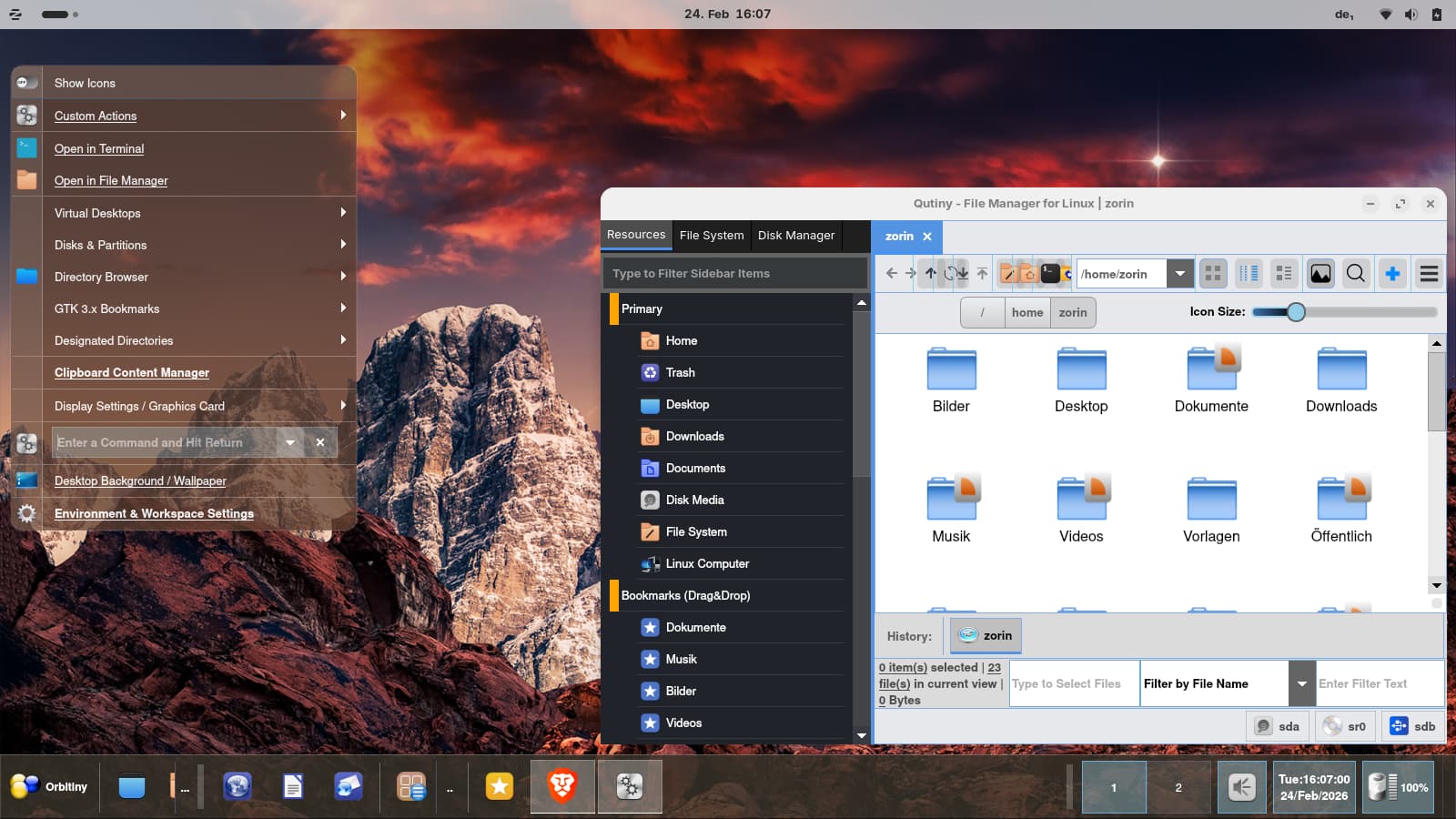 The file manager is special from the look. Interesting. You can adjust many things in this desktop, some are similar like in Enlightenment/Moksha (the menu which opens on a right click on the desktop).