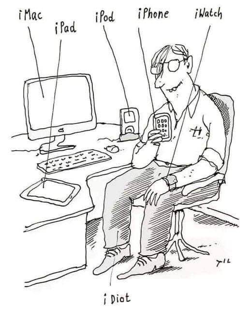 In respect of the cartoon, perhaps leaving iDiot out and just have the caption, "Someone with more money than sense(-i)".
