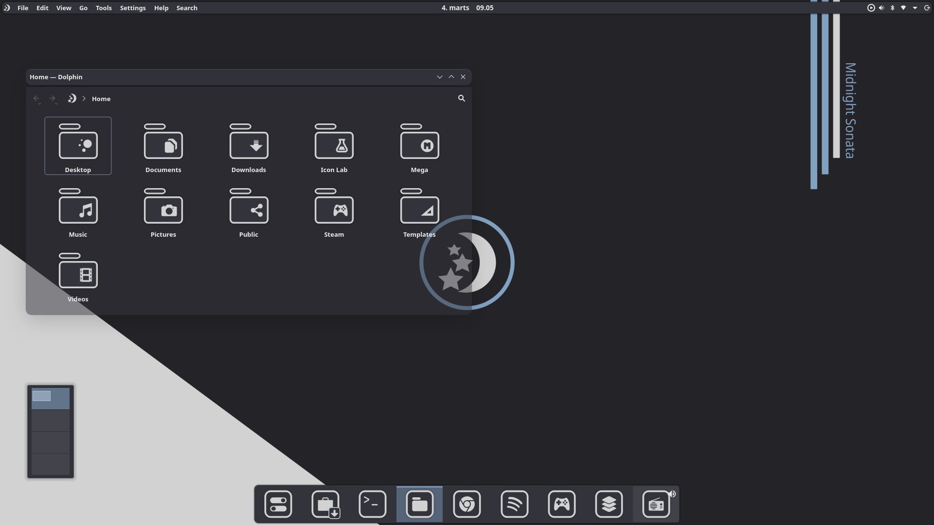Midnight Sonata is a dual-colored icon theme for KDE, Gnome, XFCE and Budgie DE. The idea to have an icon theme that goes well to "Darkly" theme. You can get "Darkly" here: GitHub - Bali10050/Darkly: Forked from the lightly theme, this style brings a fresh and unique look to your applications · GitHub