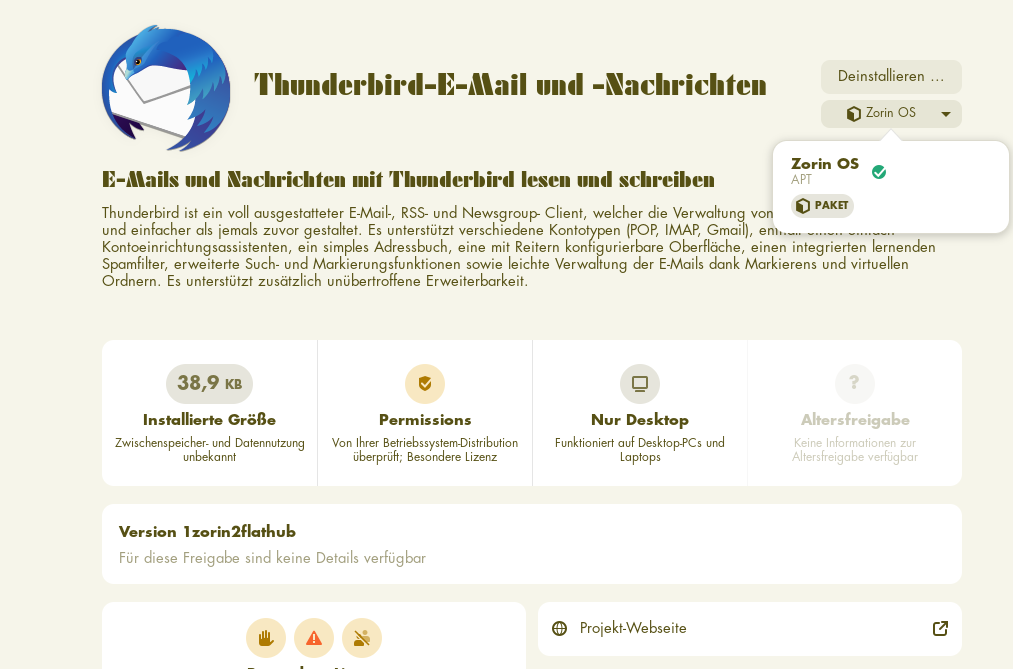 Thunderbird wasnt to be found though, also not when I listed all flatpaks. After I uninstalled what was shown in the software center I installed the flatpak and luckily everythoing was set and no new installation was needed. Good for me, but maybe a relevant feedback for the Zorin devs? I dont know how to flag them, maybe someone can do that if he/she thinks thats relevant?