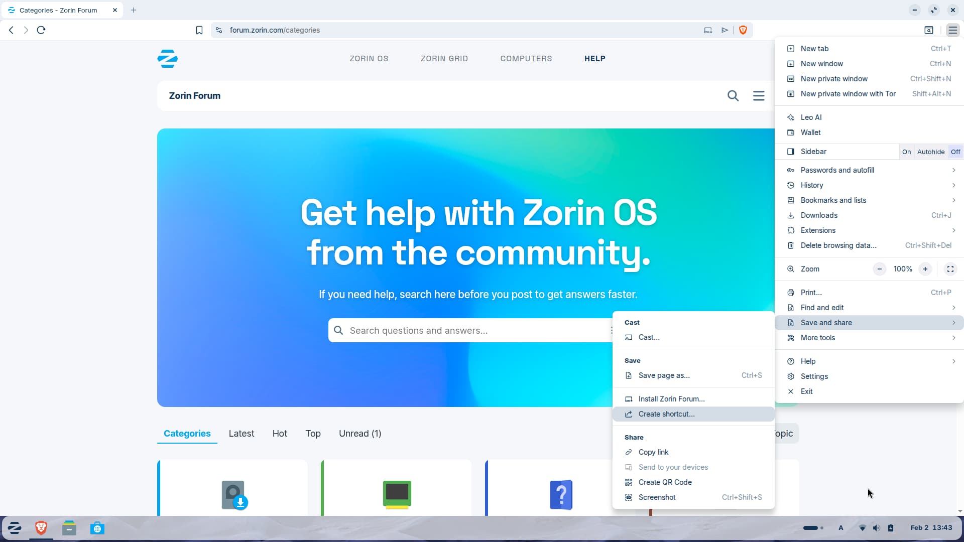 Open the website you want to add, e.g. Zorin forum. Click on the Hamburger menu (three lines) at the top right side. Select "Save and share", then "create shortcut".