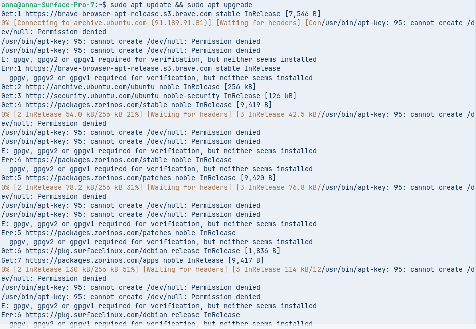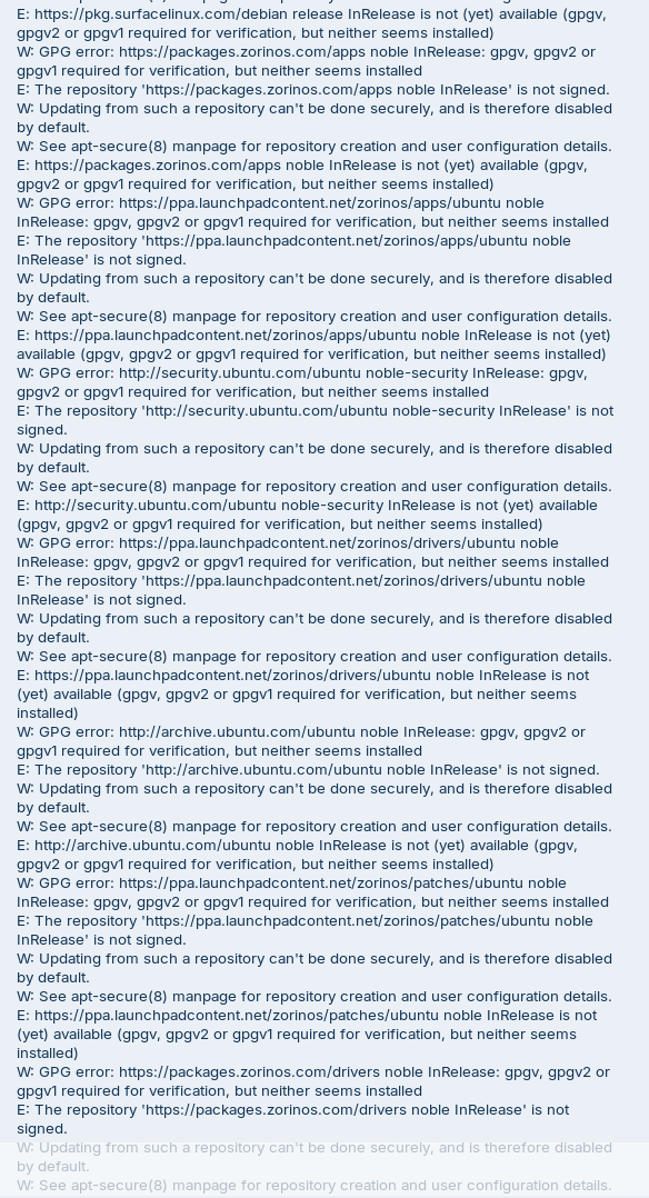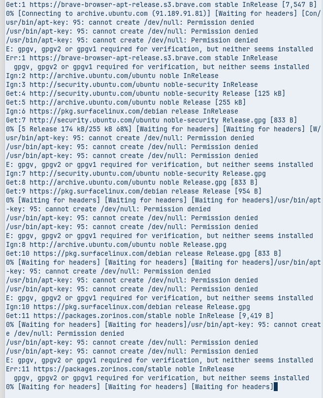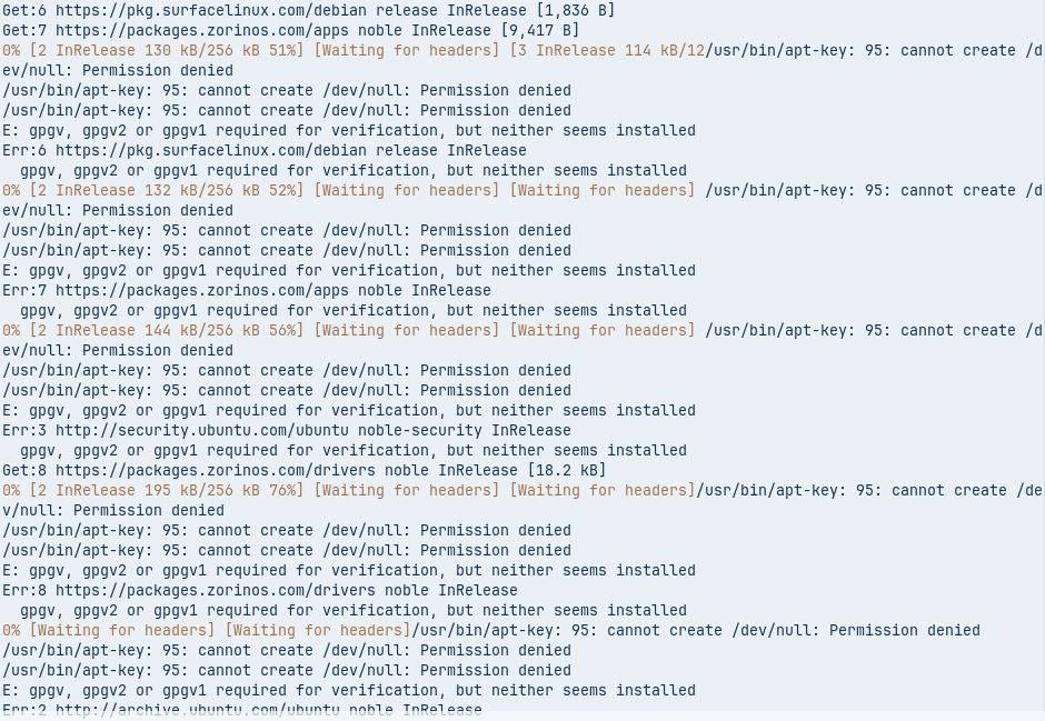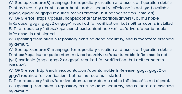 The Error mentioned You need one of them. It took a Look and on Zorin 18 seems gpgv be preinstalled. And because of Your Error Message it seems to be missed.