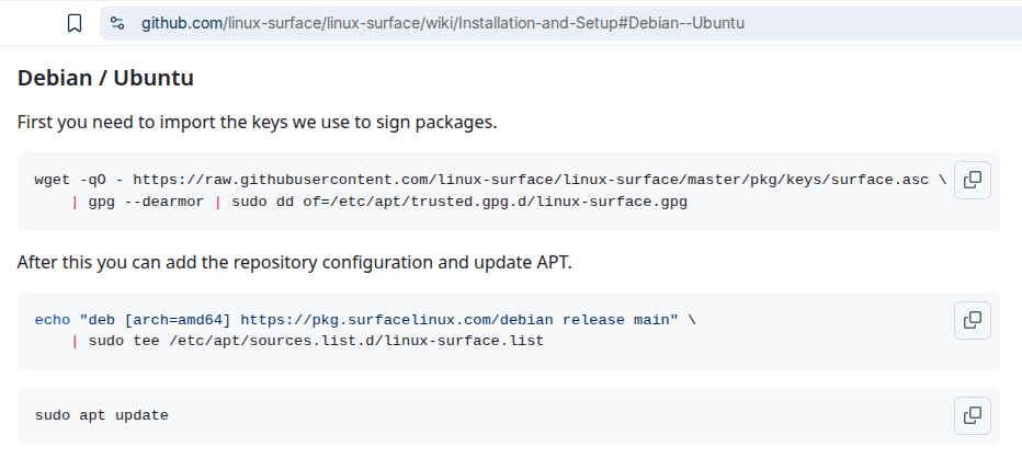 You have already added this repository for the Linux Surface kernel. I just wanted to show that it's not a problem here that "debian" is mentioned in the name and not Ubuntu.
