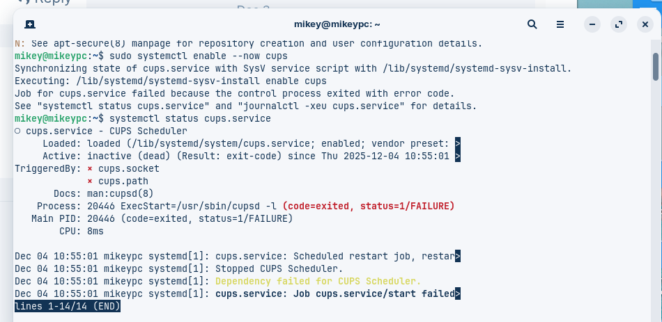 I am having a CUPS issue with my Brother printer DCP-L2550W. It used to work until the last round of updates this past week (early December). Here is the error I am getting after following the advice to run "sudo apt update && sudo apt install --reinstall cups cups-client system-config-printer"