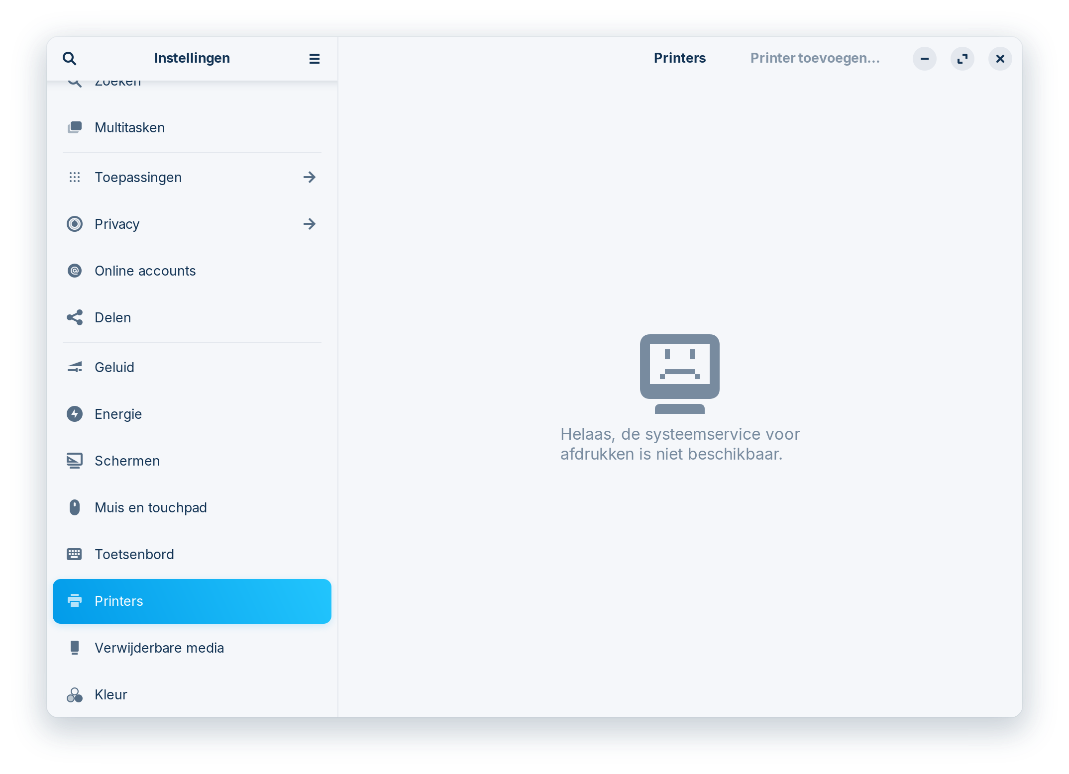 In the 'Printer' section of the 'Settings' menu is only this message: 'Unfortunately, printer service is unavailable' (Translated from Dutch)
