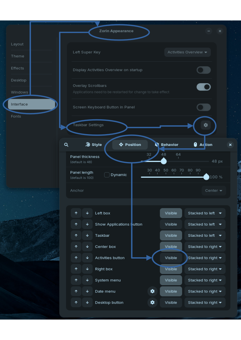 Interface - Taskbar Settings - Position - Activities button. Deselect 'Visible'. @MidnightRose that will be re-selecting 'Visible' in your case.