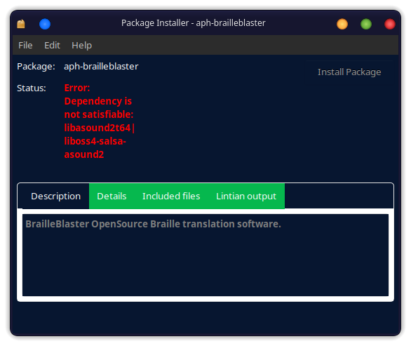 Just to add, when I moved from Feren OS to Devuan, I had a similar issue. I went on the Devuan forum and they advised I contact brailleblaster.org about a missing dependency and never got a response. It appears they are only developing the GNU/Linux version for Ubuntu. This resulted in me being forced to use a VM of Windows 8.1 to run the Windows version when I was working from home. In this country blind users suffered the loss of Standard English Braille by a committee that comprised of 18 sighted people and one blind person. The sighted people railroaded the adoption of inferior Unified English Braille. The biggest problem with UEB is over use of Braille symbols to convey what a sighted person sees, and lengthier Chemistry notation, taking up two lines of Braille, when SEB would contain it in one. Same for Maths too.