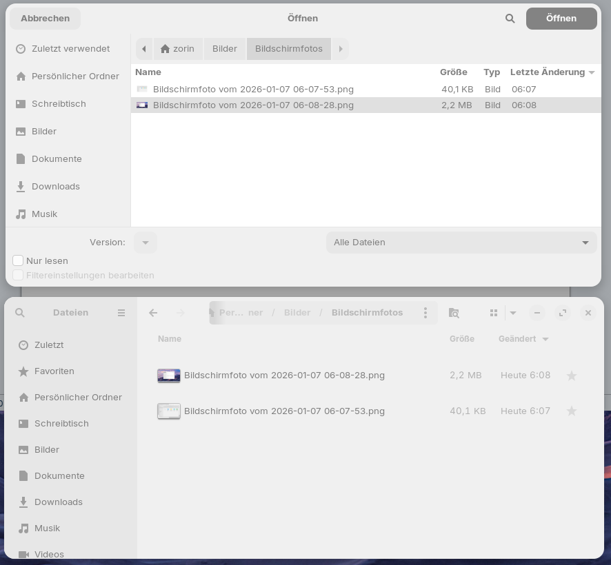 The window above ist the file picker, the window below nautilus.