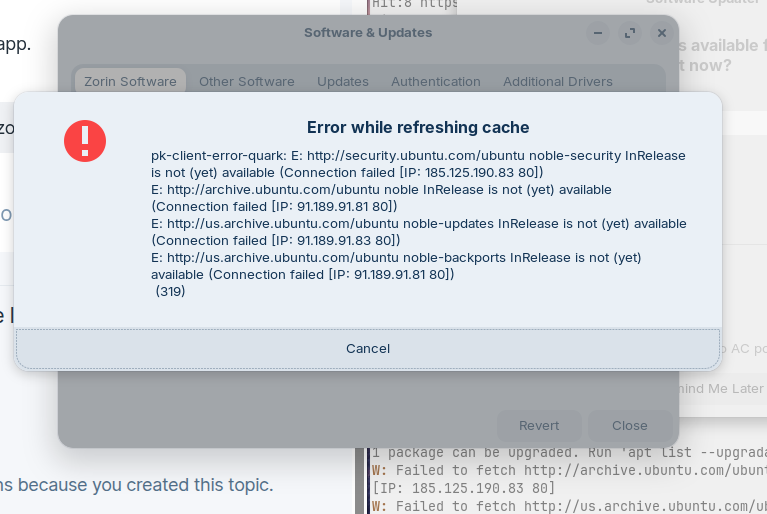 I just disabled IPv6 via the setttings for my network on Zorin so it should be on IPv4. Tried running sudo apt update again and it still failed. I'm not on a VPN and as far as I know I don't have firewall in place. I'm on my home network so it shouldn't be resitricted.