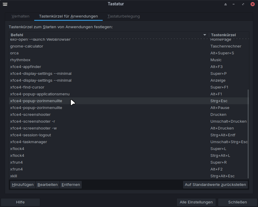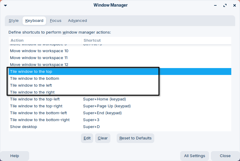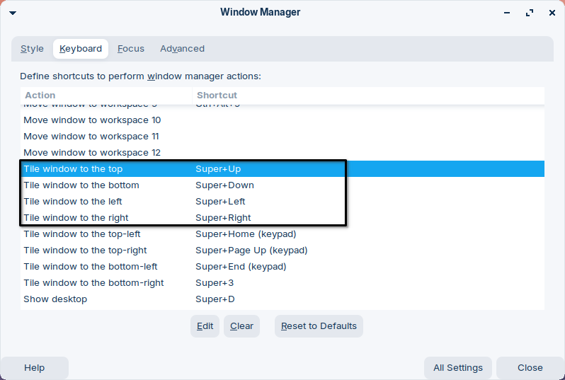 Now remap the four lines with the keys you like by clicking on edit. I used SUPER+the arrow keys.