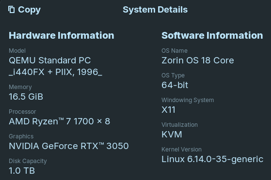 Now I am using Unraid 7.2 and running Zorin OS 18 Core in a VM with hardware passthru of: NVME SSD, Nvidia 3050 GPU, keyboard/mouse.