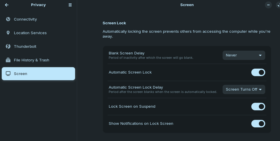 Yes, right. And Thank You for switching the Language. that looks so far good to me. You could try it with disabled ''Automatic Screen Lock'' and ''Lock Screen on Suspend''.