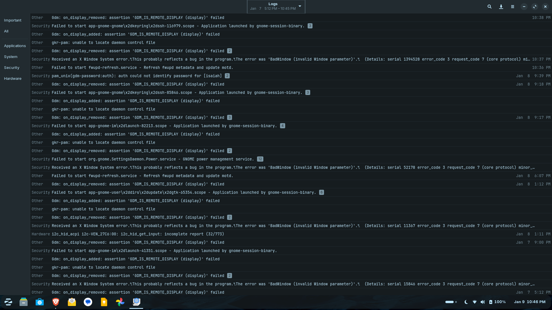 I just had my session crash and I opened up the logs to see if it reported anything and for the only to confirm for the time stamp was this "Gdm: on_display_removed: assertion 'GDM_IS_REMOTE_DISPLAY (display)' failed" That was under the Important Tab. Under System For that same time stamp I have "Lockdown: systemd-logind: hibernation is restricted; see man kernal_lockdown.7" repeated 6 times. Because I have a UPS on my system I thought I had disable some power saving options because it seemed to think my system was a laptop because of my UPS.