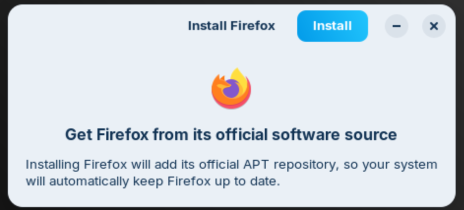 I know the history of zorin OS, I've been using it since version 15.x. However, I still can't understand this choice, which, in my opinion, is a bad design decision. Zorin OS should allow the installation of the APT version of firefox without having to manually interact with the GUI.