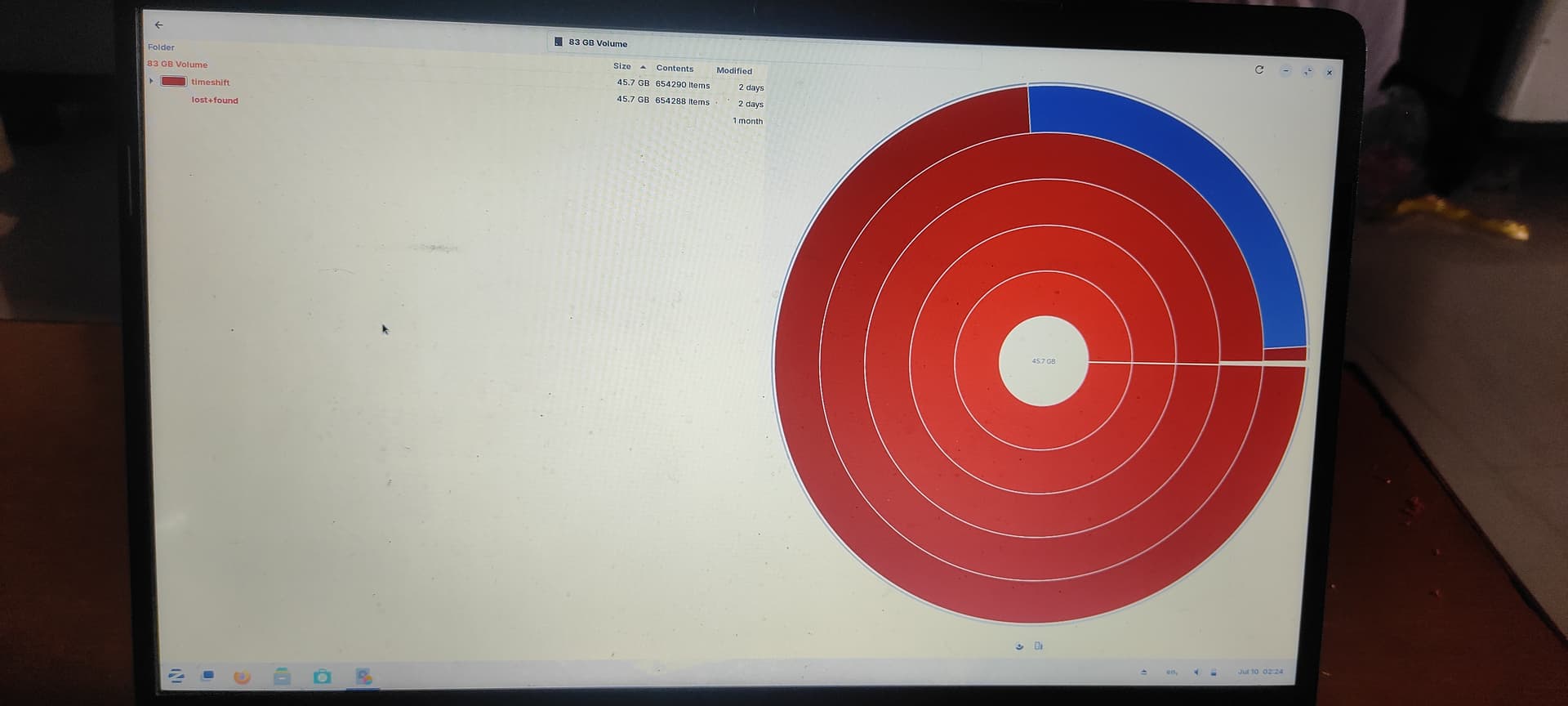 Yes , timeshift is the culprit , but I don't understand how its full as the Directory has 81gb space (i deleted the windows partition and added to time-shift's directory). Yet , its full at 45gb . How?